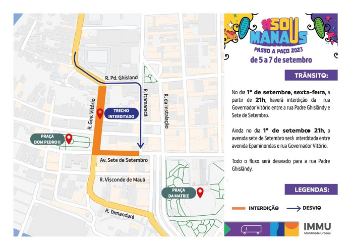 MANAUS – A Prefeitura de Manaus, por meio do Instituto Municipal de Mobilidade Urbana (IMMU), interditará determinadas vias do Centro, durante a realização do festival #Sou Manaus Passo a Paço, de 5 a 7 de setembro, para garantir a segurança dos munícipes na circulação de veículos. Além disso, será implementada uma ampla operação de trânsito e transporte para organizar as vias e orientar aqueles que se deslocam para o festival, seja de carro, a pé ou de ônibus, garantindo que o fluxo diário da cidade não seja comprometido.