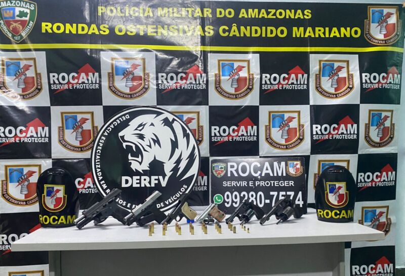 Entre os suspeitos presos pela equipe das Rondas Ostensivas Cândido Mariano (Rocam), que efetuaram a prisão dos suspeitos, estão Thiago Lima do Santos, vulgo “TH”, e Harrison Bruno Neves, o “Surfista”. Com o grupo, foram apreendidas, seis armas, sendo quatro pistolas e dois revólveres.