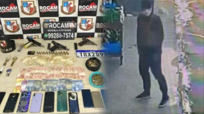 O veículo foi abandonado no bairro Raio do Sol e, com base em informações de inteligência, os policiais da ROCAM rastrearam o endereço vinculado ao documento do automóvel. No local, um homem afirmou ser o proprietário do carro e drou tê-lo alugado a um inquilino. Com autorização, a equipe da viatura revistou o quarto do suspeito, onde encontrou três pistolas de calibres .22, .40 e .45, todas com numeração suprimida, além de dezenas de munições, 11 celulares e R$ 1.640 em dinheiro — valor que pode ter sido levado durante o assalto.