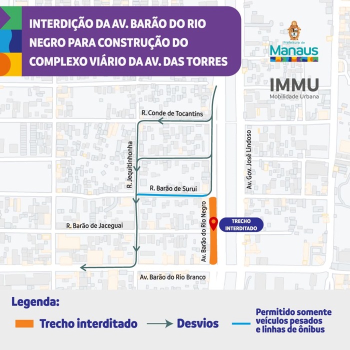 Manaus – Um trecho da Avenida Barão do Rio Negro, na zona norte de Manaus, é interditado a partir das 8h desta segunda-feira (8), para a construção do complexo viário que dará acesso à Avenida Governador José Lindoso, conhecida como Avenida das Torres, e à Avenida Barão do Rio Branco. A primeira etapa da obra deve durar 30 dias e desvios serão feitos no local.