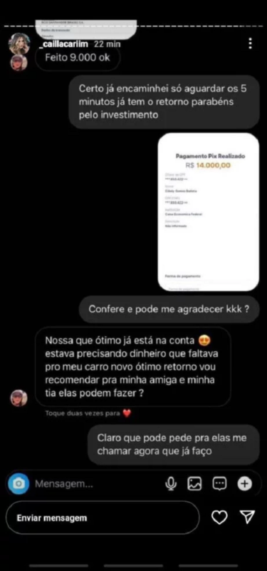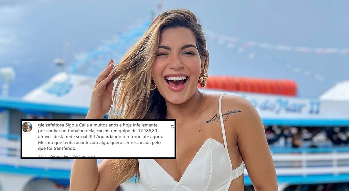 A prática, no entanto, é criminosa e fraudulenta e uma seguidora chamou atenção em uma das fotos de Caila. “Sigo a Caila a muitos anos e hoje infelizmente por confiar no trabalho dela, cai em um golpe de 17.186,80 através desta rede social !!!!! Aguardando o retorno até agora. Mesmo que tenha acontecido algo, quero ser ressarcida pelo que foi transferido”, disse.