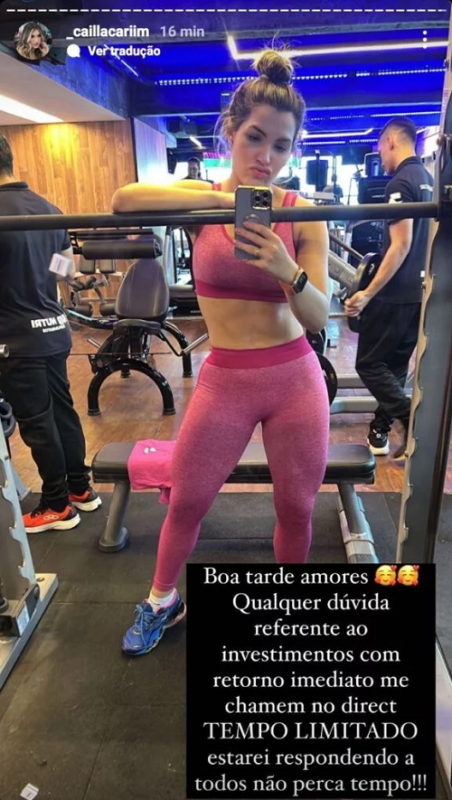 Em um dos stories, para tentar passar credibilidade, eles usam uma foto da influenciadora na academia e escreveram: “Qualquer dúvida referente aos investimentos com retorno imediato me chamem no direct”. Eles ainda usam prints de uma mulher, que provavelmente é “fake”, agradecendo e confirmando o recebimento: “Já está na conta”.
