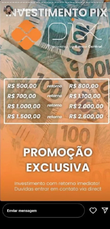A tática usada é pagamento de pix com a promessa de retornos atrativos e rápidos, como uma forma de “investimento” a partir de R$ 500. Os criminosos postaram o golpe no stories e depois disso Caila não teve mais acesso à conta, só conseguindo retornar na tarde desta quarta-fieira (9).
