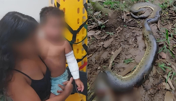 A criança brincava enquanto os pais trabalhavam nas proximidades, quando ouviram os gritos do menino. A cobra havia enrolado o corpo da criança, e o pai tentou socorrer o filho.