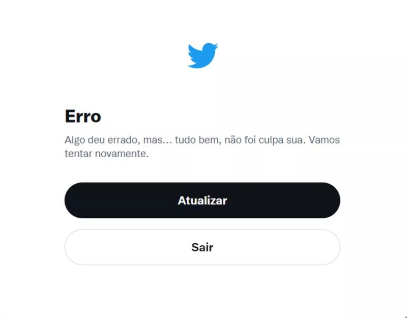 Ao tentar acessar o Twitter, o usuário é apresentado à tela inicial da rede, com as opções de login. No entanto, ao tentar entrar na plataforma, uma página de erro é exibida.