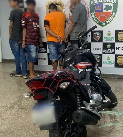 Durante revista, a polícia apreendeu uma motocicleta, uma arma de fogo, 7 celulares e 1 notebook, após questionamento os suspeitos confessaram que haviam cometido um assalto, foram presos e encaminhados para o 14º DIP.