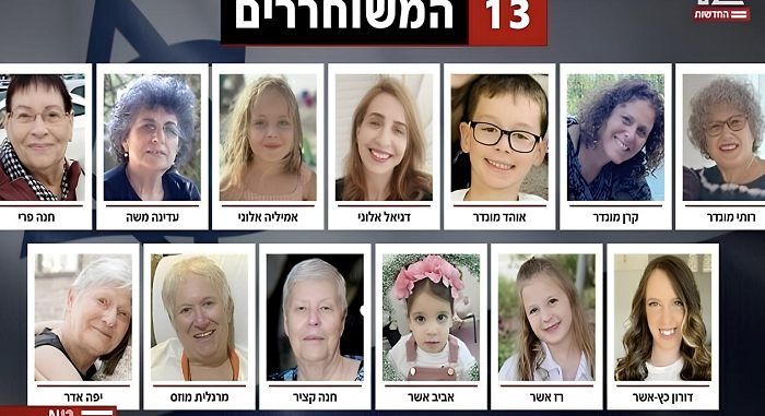Israel — Um canal de TV israelense divulgou fotos dos 13 reféns israelenses libertados pelo grupo terrorista palestino Hamas nesta sexta-feira (24).