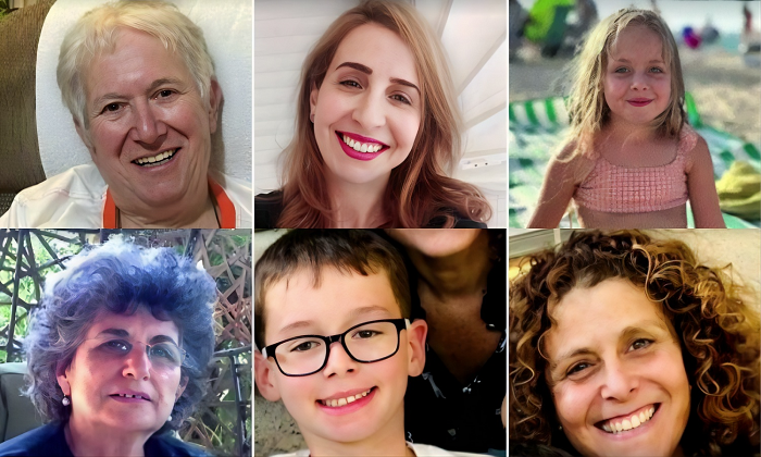 Os reféns foram identificados como (da esquerda para a direita na foto acima): Hannah Katzir, de 77 anos; Margalit Mozes, de 77 anos; Yafa Ader, de 85 anos; Hannah Perry, de 79 anos; Adina Moshe, de 72 anos; Danielle Aloni, de 44 anos, e Emilia Aloni, de 9; Ruthi Mondar, de 78 anos; Keren Mondar, de 54 anos, e Ohad Mondar, de 9; Aviv Asher, de 2 anos; Raz Asher; de 5 anos; e Katz-Asher, de 34 anos.