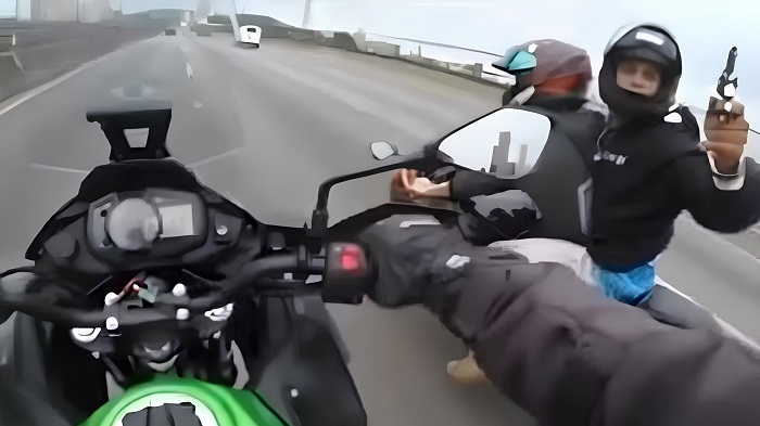 Um motociclista com câmera no capacete registrou o momento em que teve a moto Kawasaki verde dele, avaliada em cerca de R$ 34 mil, roubada por quatro assaltantes em motos que o perseguiram. O fato ocorreu no último domingo (10), na Rodovia Presidente Castello Branco, em Barueri, São Paulo, e um dos suspeitos foi preso e solto em audiência de custódia.