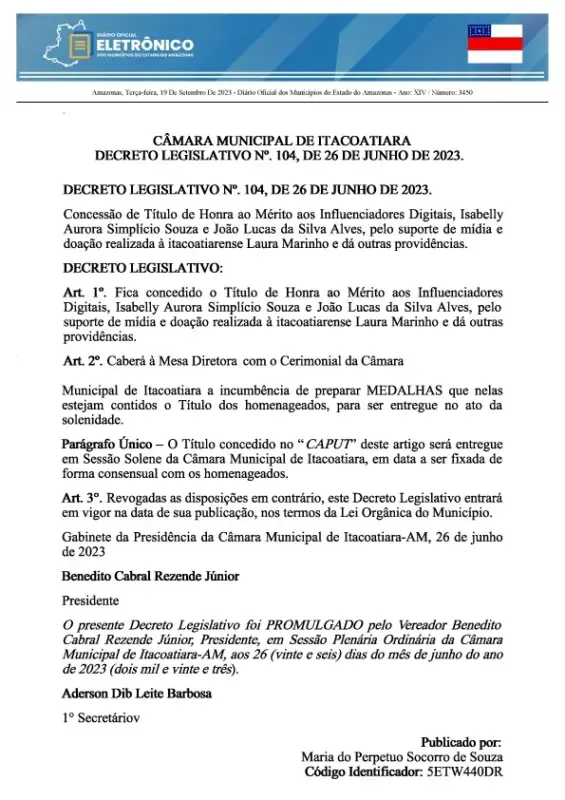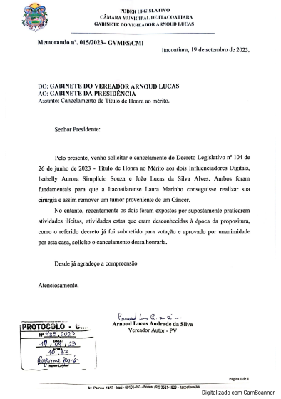 MANAUS — O vereador Arnoud Lucas Andrade da Silva (PV), do município de Itacoatiara, a 175 quilômetros de Manaus, capital do Amazonas, quer cancelar o título de honra ao mérito aos influenciadores Isabelly Aurora Simplício Souza e João Lucas da Silva Alves, conhecido como “Lucas Picolé”, indiciados por envolvimento em esquema de venda ilegal de rifas na internet. A concessão do título foi aprovada, por unanimidade, em junho deste ano, em razão da doação de R$ 200 mil à itacoatiarense Laura Marinho, diagnosticada com câncer.