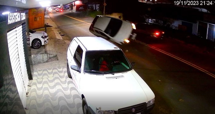 Nas imagens é possível ver um carro modelo Chevrolet Corsa parado e dando sinal para entrar em uma garagem, quando é atingindo por uma pick-up Sandeiro que trafega no outro sentido da via.