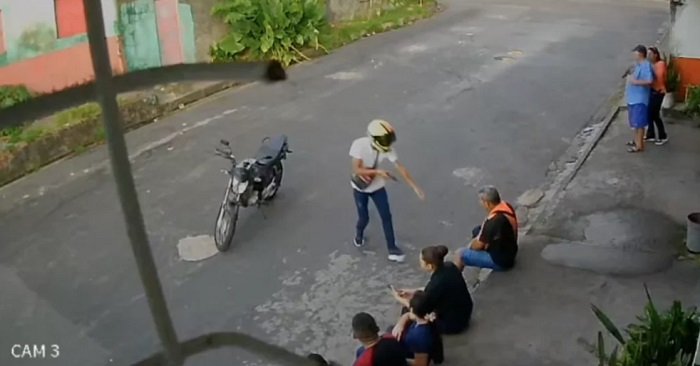 A ação foi registrada pela câmera de segurança de uma casa do bairro. Nas imagens é possível ver que o suspeito passa em uma motocicleta pela rua e olha para os industriários, que mexem no celular sem perceber o perigo. Em seguida o criminoso faz a volta na rua e retorna para roubar as vítimas. Ele chega a apontar a arma para os trabalhadores, que são obrigados a entregar os celulares. O bandido foge em seguida.
