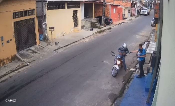 Imagens de câmeras de segurança flagraram o momento em que um trabalhador foi assaltado por um criminoso que aparentava está armado, na manhã desta quarta-feira (3), no bairro Mutirão, na zona leste de Manaus.