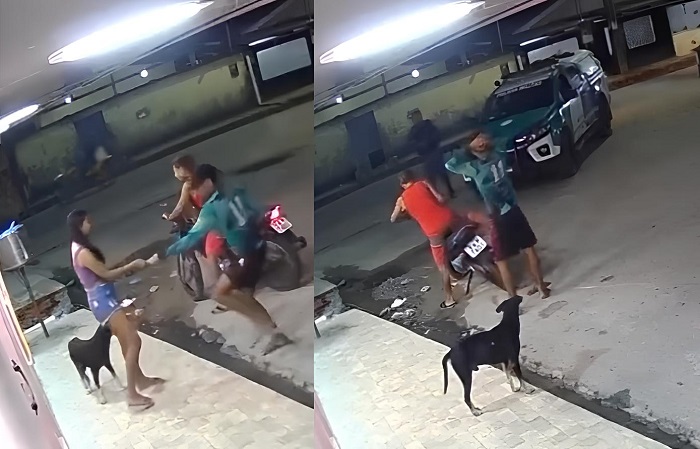 Nas imagens é possível ver o momento em que a dupla chega em uma motocicleta já anunciando o assalto. Após roubarem os celulares das vítimas, uma viatura da Ronda no Bairro se aproxima apagada devagar e flagra a ação criminosa. Os vagabundos até tentaram disfarçar, mas acabaram presos.