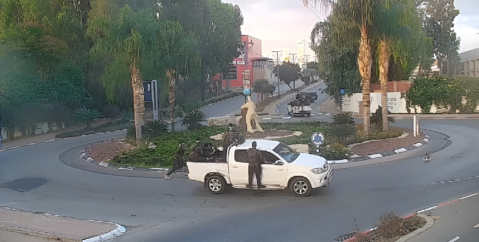 As primeiras imagens de uma câmera de trânsito em Sderot, próximo da Faixa de Gaza, mostra o momento em que um veículo Toyotas com terroristas do Hamas fortemente armados, entram na cidade, um dos quais, equipados com metralhadoras pesadas.
