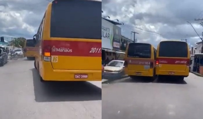 Um vídeo enviado por um internauta mostra o momento em que motoristas de ônibus executivo, conhecidos como “Amarelinhos”, disputam um racha em uma rua movimentada de Manaus.