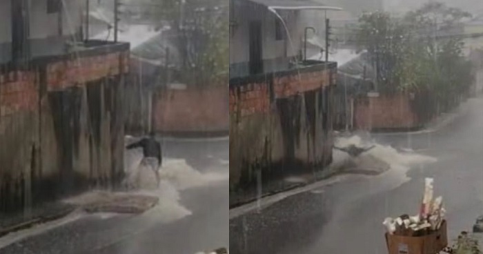 Manaus – Durante a forte chuva que caiu na capital nesta quarta-feira (17), o vídeo de um homem que foi atropelado por um colchão viralizou nas redes sociais. O vídeo compartilhado mostra um homem que tenta se equilibrar na esquina de uma rua no conjunto Nova Floresta, zona leste de Manaus, quando um colchão é arrastado com a força da água e atinge o homem que cai no meio-fio.