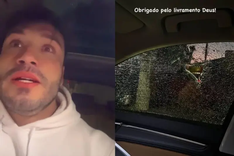 “Gente, tentaram me assaltar aqui, agora. Eu reagi, acelerei, e o cara deu um tiro no carro, [que acertou] na janela. Não sei nem como não acertou em mim, cara. Meu Deus do céu. Foi um milagre. Misericórdia de Deus. Obrigado pelo livramento”, narrou ele, ainda assustado.