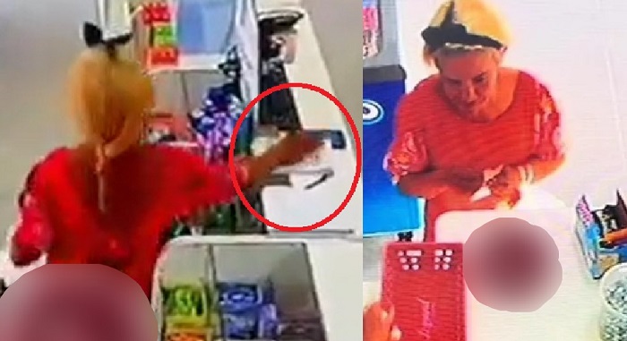 Sem saber que estava sendo filmada, ela passa a mão no aparelho que está em cima do balcão enquanto a funcionária não está no local. Aparentemente a idosa o coloca dentro de uma sacola.