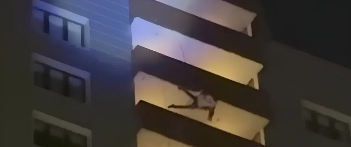 Iluminado por um holofote, o homem caiu sobre uma estrutura de neve, um andar acima do solo, o que causou a morte dele instantaneamente.
