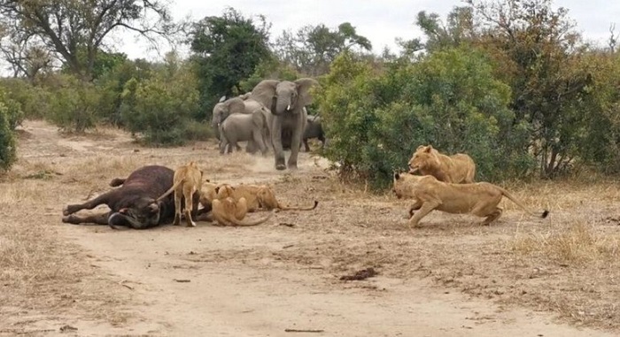 Um jovem leão atacou e assustou os elefantes, que provavelmente não esperavam uma demonstração de força dos felinos. Como a vida prossegue em todos os ecossistemas, os elefantes simplesmente decidiram ir embora e beber água em um rio próximo. O grupo de leões comeu o búfalo por cerca de um dia e meio, segundo o guia.