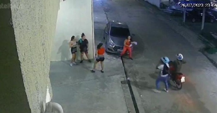 Na gravação, é possível ver os homens chegando em uma motocicleta e abordando as mulheres que aguardavam do lado de fora do estabelecimento. O garupa saltou e exigiu os pertences das vítimas, mas duas das mulheres conseguiram correr para dentro do local quando perceberam o assalto.