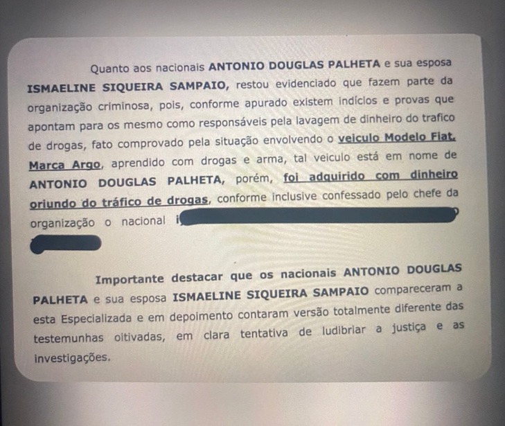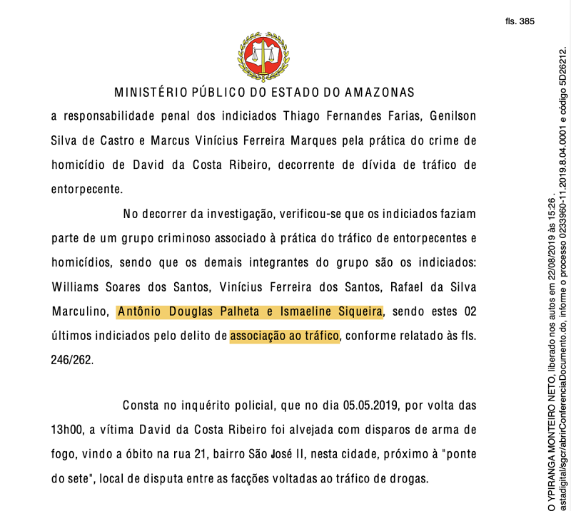 Ao investigarem cada suspeito envolvido no assassinato de David, as autoridades identificaram que o marido de Ismaeline, Antônio Douglas Palheta Mar, e ela própria, teriam vínculos próximos com esse grupo criminoso. A partir daí surgiu a suspeita de que o casal tinha participado de um esquema para adquirir um carro para Thiago, que seria o chefe da quadrilha, conhecido como ‘Thiago Zureta’ no mundo do crime.