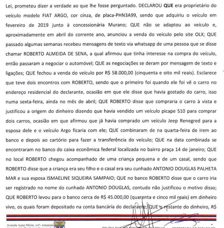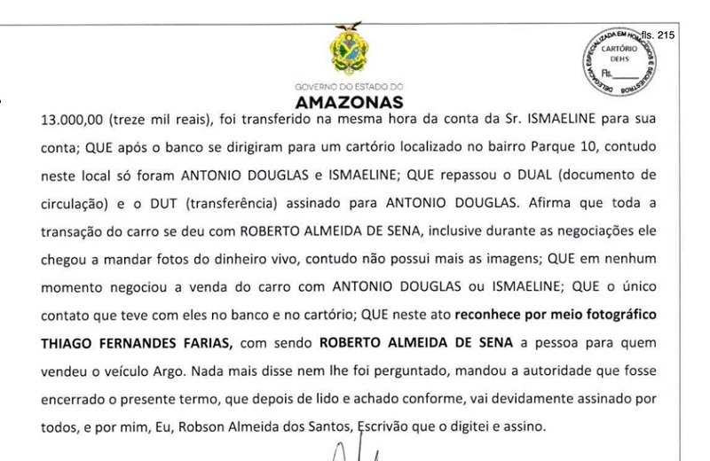 De acordo com documento divulgado na reportagem, Thiago usou o nome falso de ‘Roberto de Almeida Sena’ para adquirir um veículo Fiat Argo no aplicativo de compra e venda OLX. Ele fez todas as negociações com o vendedor e no ato da compra, foi acompanhado de Douglas e Ismaeline alegando que o ‘garanhão da Bemol’ era seu cunhado.