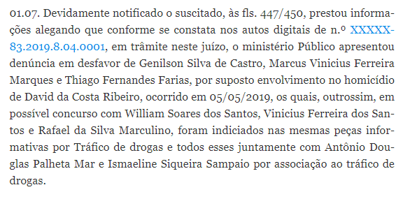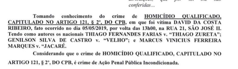 De acordo com a matéria de um portal local, a investigação teve início enquanto a Polícia Civil tentava elucidar um homicídio ocorrido em 5 de maio de 2019, no qual David da Costa Ribeiro, de 32 anos, foi brutalmente executado em razão de uma grande dívida que tinha com traficantes integrantes de uma facção. Essa investigação apontou que Genilson Silva de Castro, Marcus Vinicius Ferreira Marques e Thiago Fernandes Farias estavam envolvidos no crime.