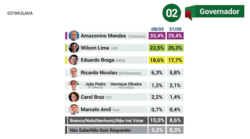Em terceira posição está o senador Eduardo Braga (MDB), que caiu quase um ponto percentual. No estudo de março ele tinha 18,6% e agora está com 17,7%.