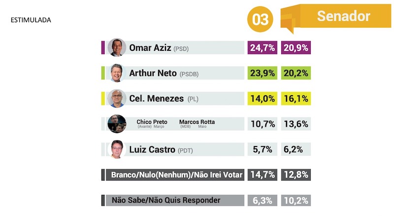 Já na corrida para uma cadeira no senado federal, o senador Omar Aziz (PSD) lidera corrida com 20,9% das intenções de votos, a frente do ex-prefeito de Manaus Arthur Neto (PSDB), que segue na segunda colocação com 20,2%.